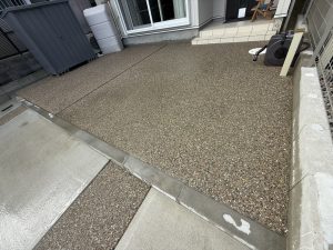 さらに、ただのコンクリートで終わらせないのがエーコーテック流! 注目は、和風にも洋風にもマッチする「洗い出し仕上げ」です💡。小石や砂利の質感が、駐車場やアプローチに温かみのあるおしゃれな雰囲気を作り出します。見た目の美しさだけでなく、滑りにくい機能性も兼ね備えているんですよ。まるでカフェのような素敵な外構に大変身させませんか?☕🌳